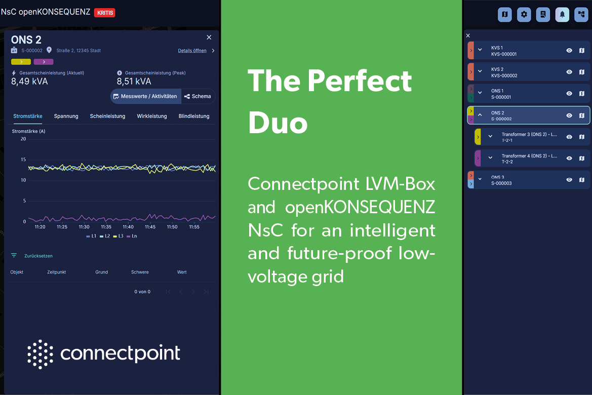 The solution for ensuring stability in the low‑voltage grid is the combination of the ConnectPoint LVM Box and the openKONSEQUENZ Low Voltage Cockpit. ConnectPoint integrates both components efficiently into any system landscape.