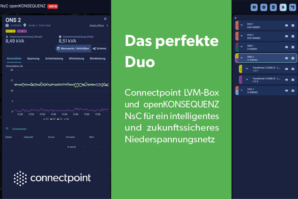 Die Lösung für die Stabilität des Niederspannungsnetzes heißt ConnectPoint LVM-Box kombiniert mit openKONSEQUENZ Niederspannungscockpit. Beide Komponenten integriert ConnectPoint effizient in jede Systemlandschaft.