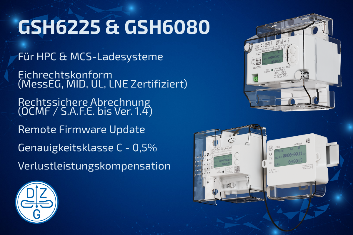 Mit den neuen DC-Gleichstromzählern GSH6080 (bis 0,8 MW / 800 kW) und GSH6225 (bis 2,25 MW / 2.250 kW) erweitert DZG Metering sein Portfolio für den Einsatz in modernen DC-Ladesäulen. Beide Geräte erfüllen die Anforderungen der MID, der UL-Zertifizierung sowie des deutschen Eichrechts (MessEG/EV). Damit sind sie weltweit einsetzbar – von klassischen AC/DC-Ladestationen bis hin zu leistungsstarken High-Power-Charging-Anwendungen.
