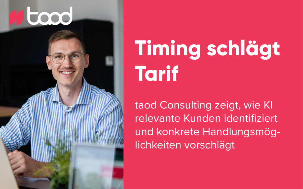 Unter dem Leitgedanken „Timing schlägt Tarif“ zeigt die Data- & AI-Beratung taod, wie Energieunternehmen mithilfe individuell entwickelter, KI-basierter Kundenwertanalysen erkennen können, welcher Kunde wann relevant ist und welche Handlung zu diesem Zeitpunkt den größten wirtschaftlichen Effekt erzielt.