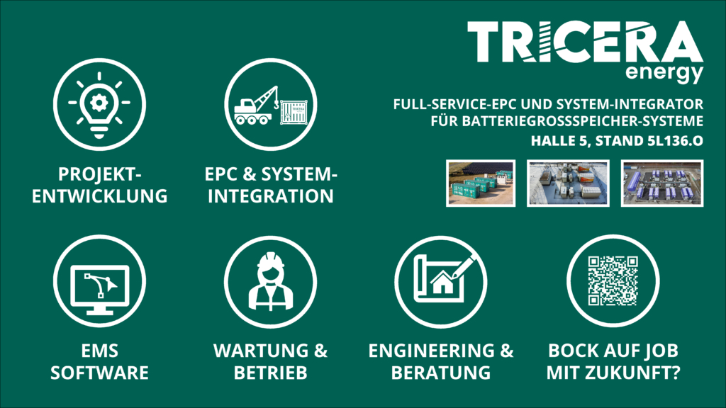 TRICERA energy ist einer der größten deutschen Generalunternehmer (EPC) und Systemintegrator für Large-Scale-Batteriespeicheranlagen. Bis zum heutigen Tag hat das Unternehmen 290 MWh an Kapazität und 150 MW an Leistung verbaut, weitere 110 MWh und 60 MW sind bereits in der Umsetzung. Vom 10.-12. Februar wird der Batteriespeicher-Experte erstmals mit einem Stand (5L136.O) auf der E-World, dem Branchentreffpunkt der europäischen Energiewirtschaft, vertreten sein.