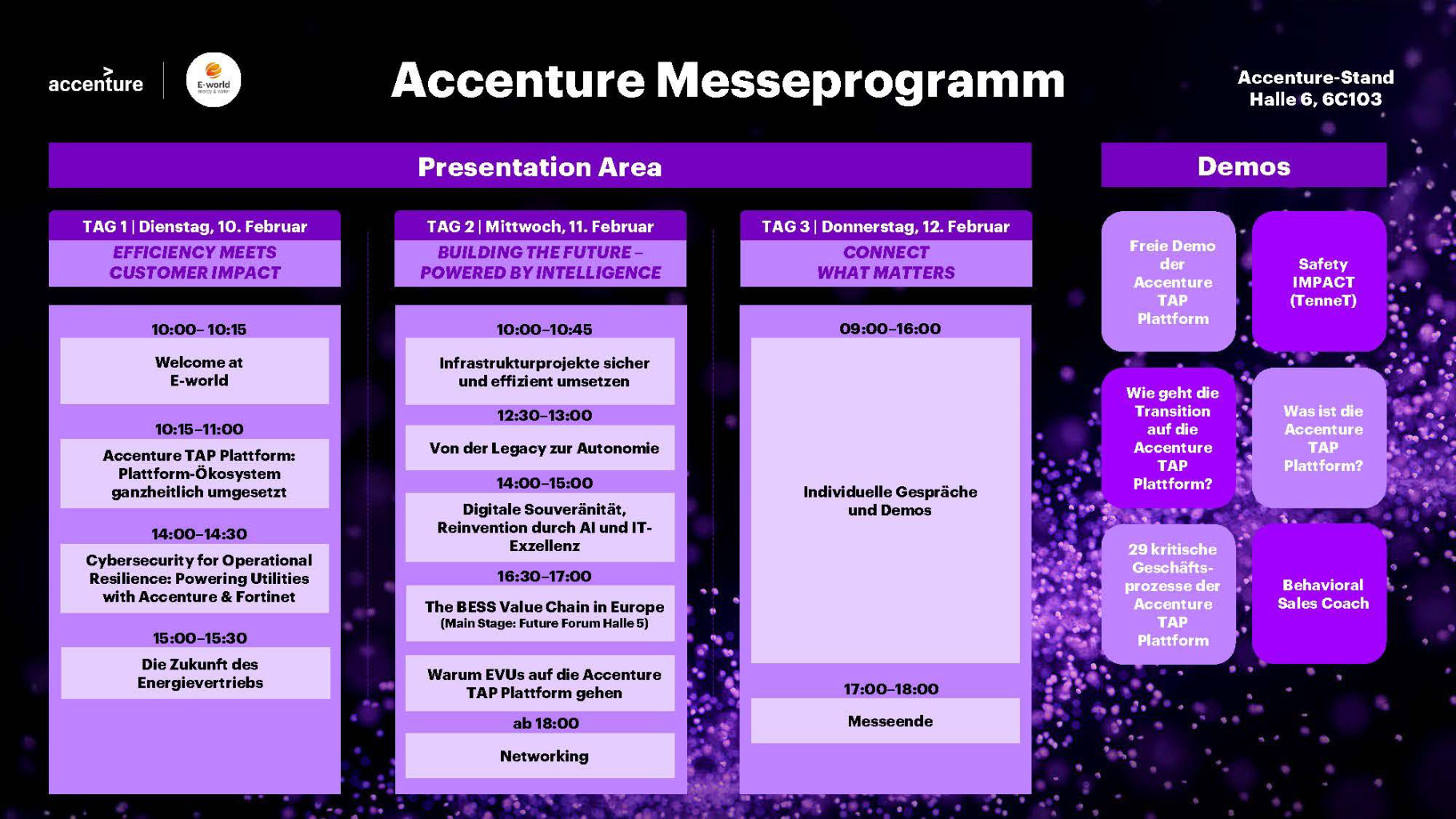 Am 10. Februar 2026 präsentieren Jan-Wilm Buschkamp und Patrick Frontzek (TAP SG) von 10:15 bis 11:00 Uhr gemeinsam mit Robert Haber und Holger Viehmann (Accenture DACH), wie die Accenture TAP Plattform technologische, regulatorische und operative Anforderungen integriert und warum Plattformlösungen die Antwort auf die Komplexität der Energiewirtschaft sind. Am 11. Februar 2026 schildern Vertreter der TAP-Partnerunternehmen von 16:30 bis 17:00 Uhr, warum sie sich für die Plattform entschieden haben. Die Moderation übernimmt Simon Federle, Leiter Kommunikation bei TAP SG.